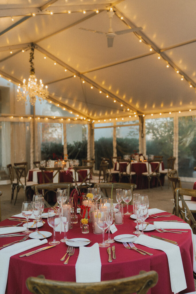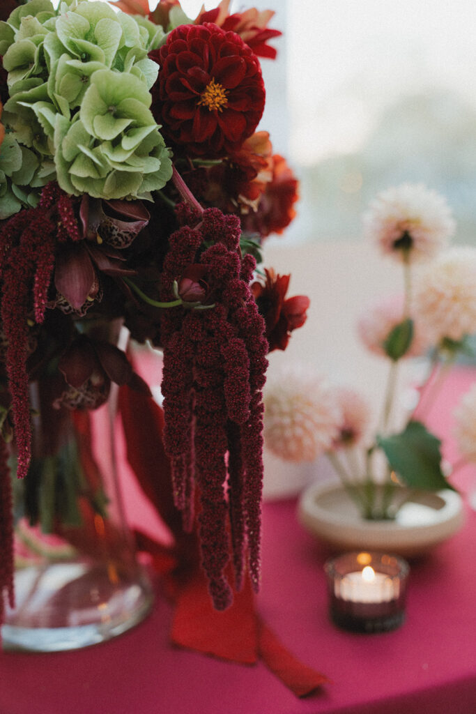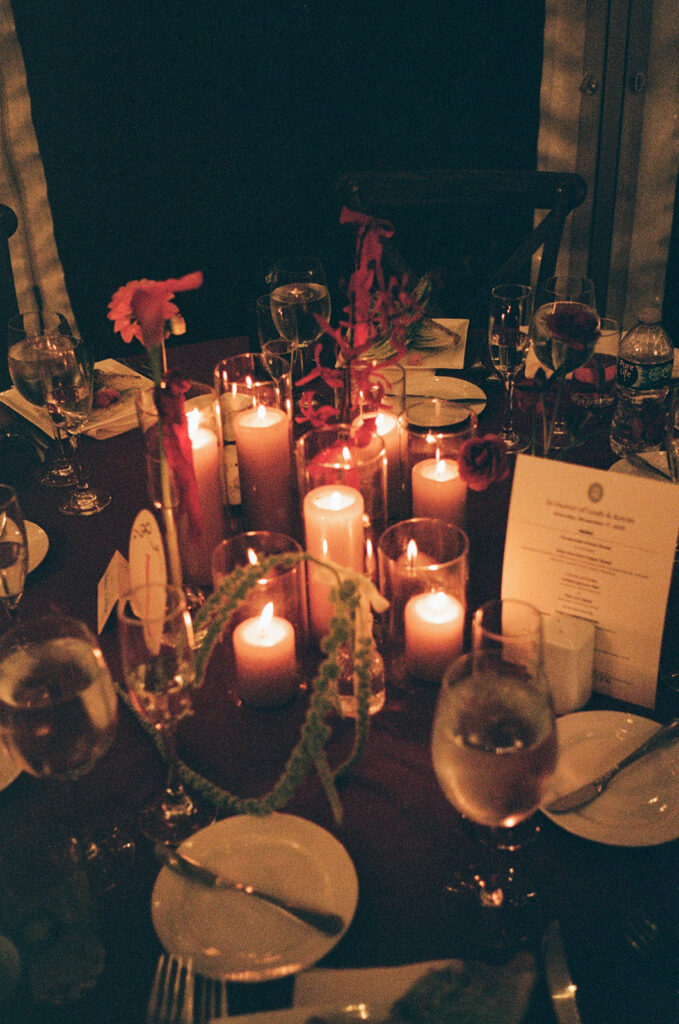 Following the ceremony, Leah and Kevin enjoyed a cocktail hour in the courtyard with their guests. The crisp autumn air and matching golden foliage made for beautiful scenery while they enjoyed time with their guests that continued on into the reception. Wine colored linens covered tables decorated with handpainted table number signs and Anthurium. (Fun fact: those are better known by their nickname, Painter’s Palette. Fitting, huh?)