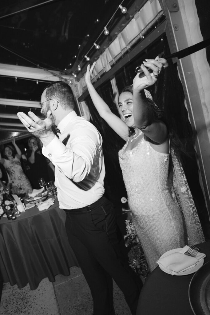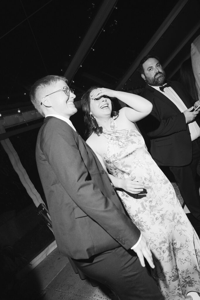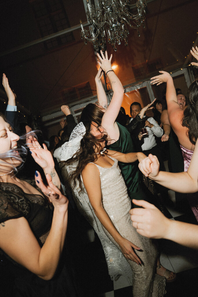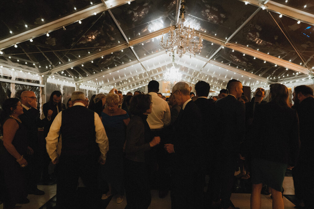 The happy couple danced the night away together under cafe lights & a chandelier atop a black and white checkered dance floor. It wasn’t long before guests joined in the fun! Following speeches, cake (devil’s food with raspberry jam and vanilla buttercream, by the way), and signature drinks, everyone in attendance let their hair down. This celebration was incredible from start to the moment the very last guest left for the night!