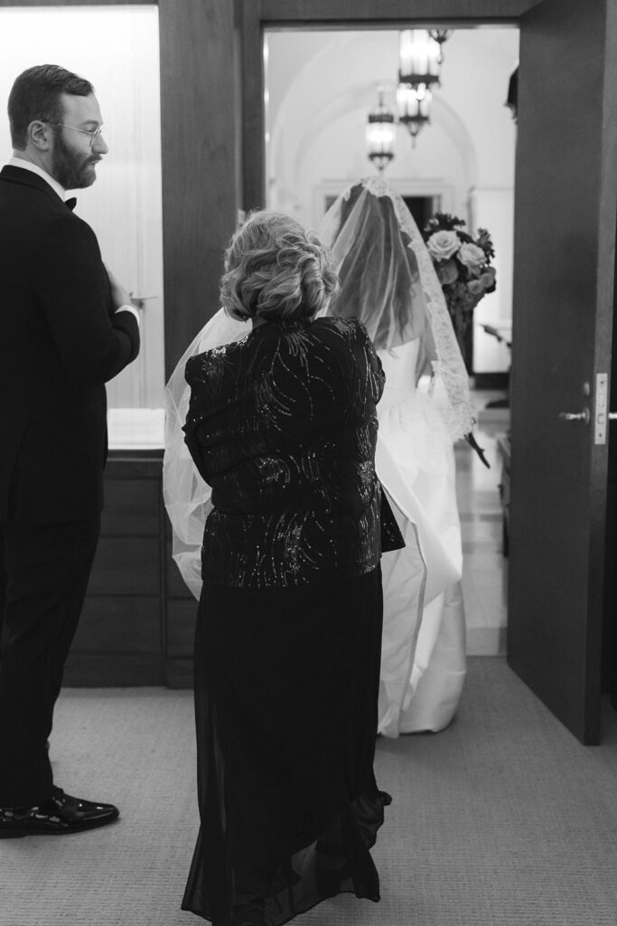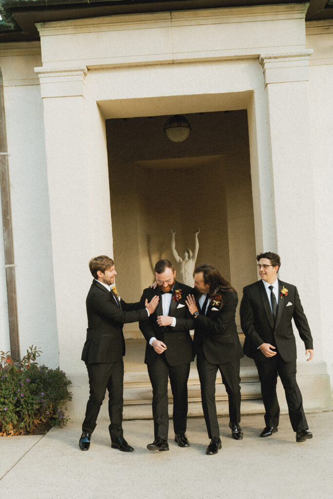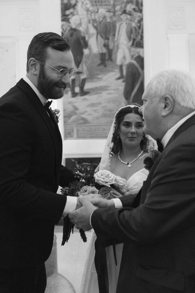 Cool details aside, I love how in love these two are. From the moment they arrived, they were so emotional with each other and their friends. Leah cried all day – it was so sweet! They were ecstatic during their first look and that energy continued into their ceremony. Candles lined the grand staircase that led to the arch where they said their vows. They exchanged “I dos” surrounded by artwork as their closest friends and family looked on from above and below. It was a beautiful ceremony to say the least!