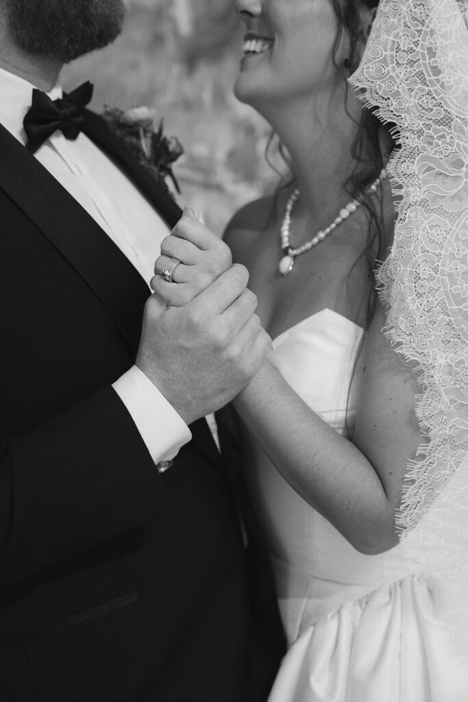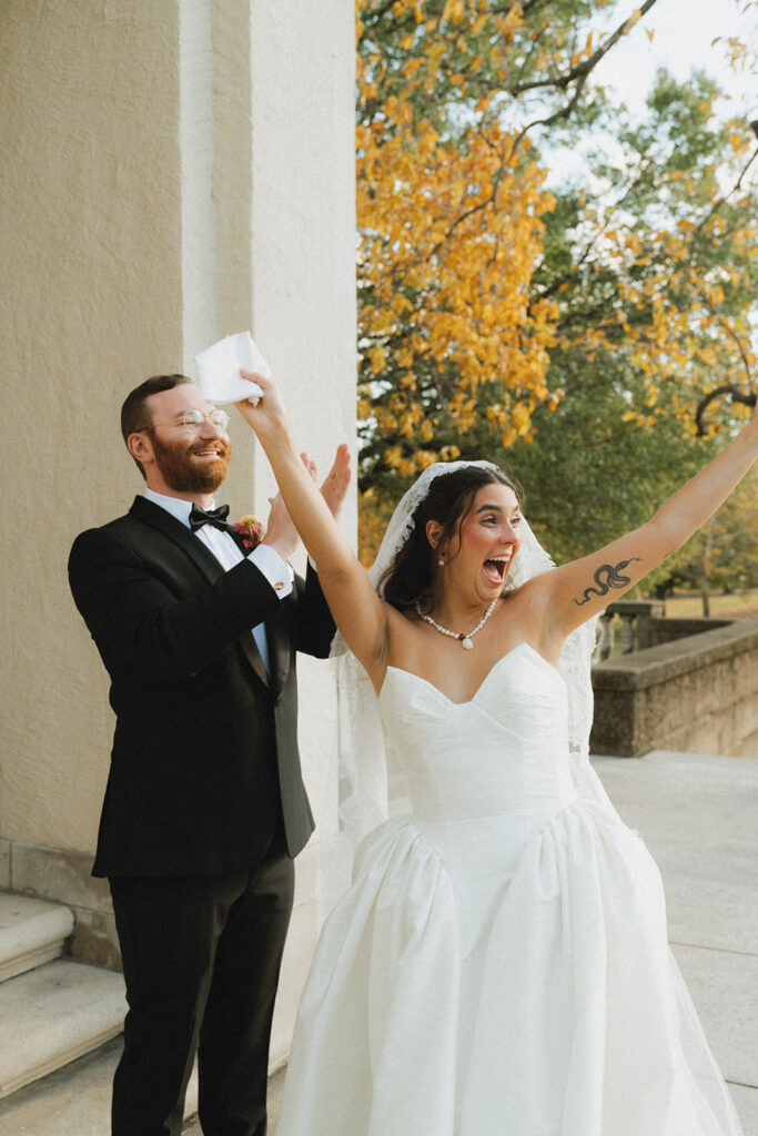 Leah and Kevin are art lovers in different ways. Kevin is big into movies and film, and Leah wanted a more fashion-forward look for her wedding day. The resulting details were the perfect marriage of the two! Every decision, from the personalized vibrant red-orange matchbooks for guests to the seashell cufflinks Kevin wore, was intentional, honest, and bold. The bouquet and floral arrangements by Caroline Florals were unexpected and stunning. Leah’s shoes were unique and paired perfectly with her pearl necklace and lace trimmed veil. Even the venue itself (along with their art-filled guest book) was a tribute to their personalities and story.